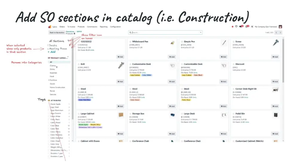De Sales-app kreeg een strakkere en gebruiksvriendelijkere workflow. Offertes en verkooporders kunnen nu worden opgedeeld in secties (bijv. per productcategorie) en voorzien van standaardkoppen en -voetteksten op de afdrukken.